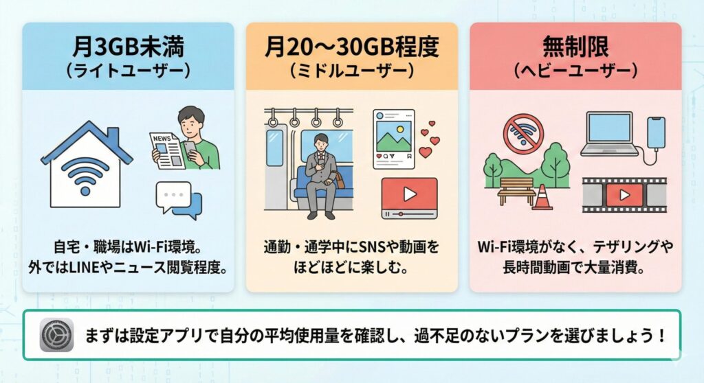 - 月3GB未満: 自宅や職場に常にWi-Fiがあり、外ではLINEやニュース閲覧程度。