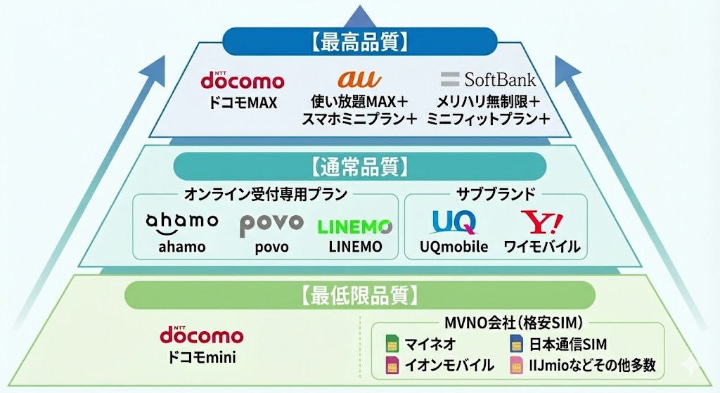 - 品質: ストレスフリーなら大手・サブブランド、安さ限界突破ならMVNO。