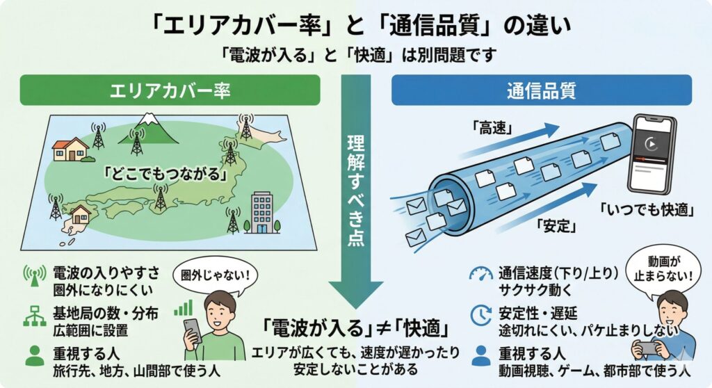 - 注意点: SoftBankや楽天モバイルは、主要幹線道路から外れると電波が弱まる傾向があります。