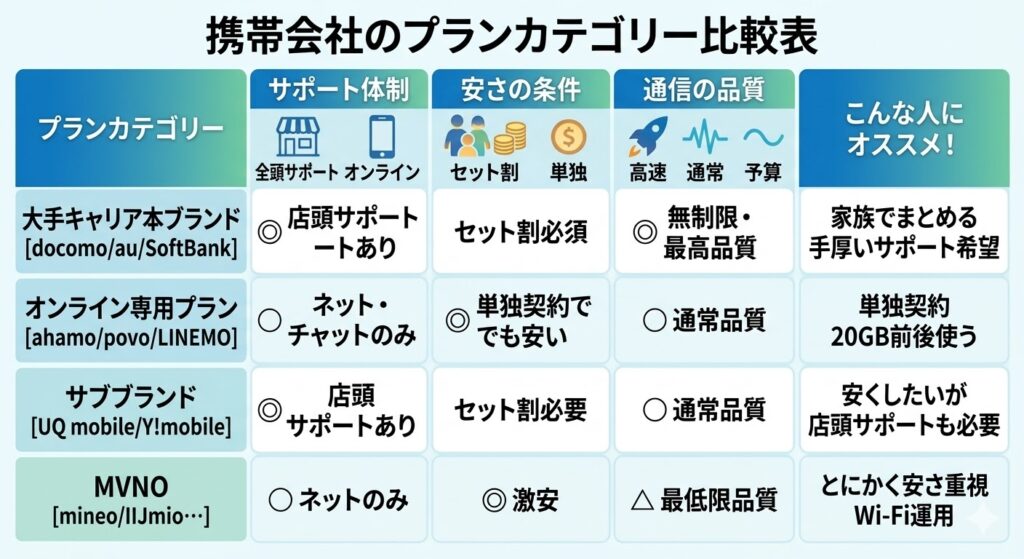 - 品質: ストレスフリーなら大手・サブブランド、安さ限界突破ならMVNO。